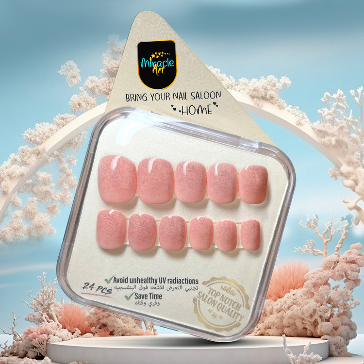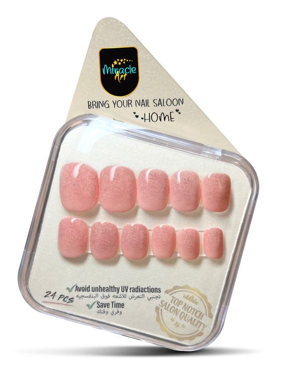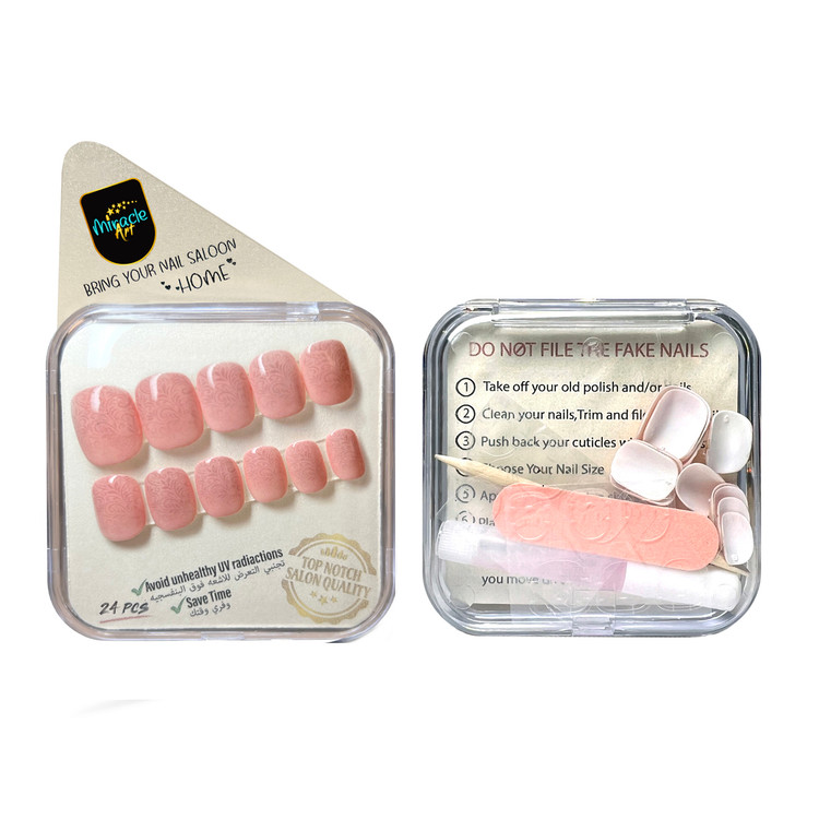ناخن مصنوعی میراکل آرت، مدل کوتاه با طرح Salmon Ombre که در بسته 24 عددی عرضه گردیده است و ساخت کشور امارات میباشد. این ناخن کاشت موقت (ناخن مصنوعی) با طراحی های منحصر به فرد و زیبا که تمام آن کار دست میباشد یک محصول خاص است که یک سالن آرایشی کامل را به خانه زیباجویان می آورد. این محصول با مواد اکرلیک و ژلیش کاشت ناخن که دارای مقاومت و استحکام بسیار بالایی میباشند ساخته شده است. این محصول مناسب برای تمامی سایزهای ناخن میباشد، چرا که در بسته آن 24 عدد ناخن با سایزهای مختلف وجود دارد که مناسب برای هر فردی به طور اختصاصی است و به همین دلیل از سایز s تا xl را پشتیبانی میکند. این محصول یکبار مصرف نبوده و امکان استفاده چندین باره با رعایت اصول میسر می باشد. از مزایای این نوع ناخن مصنوعی سرعت بالا در انجام نصب و نیاز نداشتن به ترمیم میباشد. این مدل را میتوان در کمتر از چند دقیقه بر روی دست چسباند و یا جدا کرد. از دیگر ویژگی های این نوع ناخن مصنوعی بدون بو بودن، مواد اولیه غیر سمی و لبه های بسیار نازک و ظریف میباشد. افرادی که به تمیزی ناخن ها خود اهمیت میدهند و یا نیاز به ناخن موقت برای مراسم ها و جشن ها دارند و یا استفاده از لاک ناخن و کاشت دائمی برای آنها مقدور نمیباشد این محصول یک گزینه مناسب برای آنها میباشد. محتویات داخل جعبه این محصول شامل 24 عدد ناخن با سایزهای کاربردی، خلال چوبی مخصوص مانیکور، چسب مایع مخصوص، چسب استیکری دو طرفه و مینی سوهان ناخن میباشد. از ویژگی های این محصول میتوان به ظاهر بسیار طبیعی، قابلیت شستشو بودن، نصب و استفاده آسان در کمتر از چند دقیقه و قابلیت استفاده به دفعات بسیار اشاره کرد.