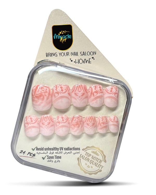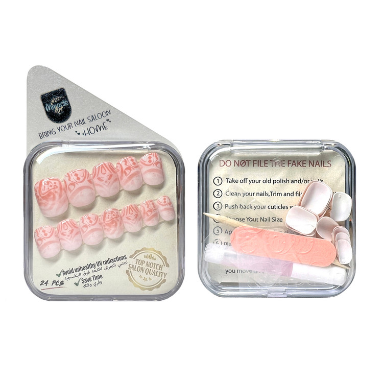 ناخن مصنوعی میراکل آرت، مدل کوتاه با طرح Rose Calligraphy که در بسته 24 عددی عرضه گردیده است و ساخت کشور امارات میباشد. این ناخن کاشت موقت (ناخن مصنوعی) با طراحی های منحصر به فرد و زیبا که تمام آن کار دست میباشد یک محصول خاص است که یک سالن آرایشی کامل را به خانه زیباجویان می آورد. این محصول با مواد اکرلیک و ژلیش کاشت ناخن که دارای مقاومت و استحکام بسیار بالایی میباشند ساخته شده است. این محصول مناسب برای تمامی سایزهای ناخن میباشد، چرا که در بسته آن 24 عدد ناخن با سایزهای مختلف وجود دارد که مناسب برای هر فردی به طور اختصاصی است و به همین دلیل از سایز s تا xl را پشتیبانی میکند. این محصول یکبار مصرف نبوده و امکان استفاده چندین باره با رعایت اصول میسر می باشد. از مزایای این نوع ناخن مصنوعی سرعت بالا در انجام نصب و نیاز نداشتن به ترمیم میباشد. این مدل را میتوان در کمتر از چند دقیقه بر روی دست چسباند و یا جدا کرد. از دیگر ویژگی های این نوع ناخن مصنوعی بدون بو بودن، مواد اولیه غیر سمی و لبه های بسیار نازک و ظریف میباشد. افرادی که به تمیزی ناخن ها خود اهمیت میدهند و یا نیاز به ناخن موقت برای مراسم ها و جشن ها دارند و یا استفاده از لاک ناخن و کاشت دائمی برای آنها مقدور نمیباشد این محصول یک گزینه مناسب برای آنها میباشد. محتویات داخل جعبه این محصول شامل 24 عدد ناخن با سایزهای کاربردی، خلال چوبی مخصوص مانیکور، چسب مایع مخصوص، چسب استیکری دو طرفه و مینی سوهان ناخن میباشد. از ویژگی های این محصول میتوان به ظاهر بسیار طبیعی، قابلیت شستشو بودن، نصب و استفاده آسان در کمتر از چند دقیقه و قابلیت استفاده به دفعات بسیار اشاره کرد.