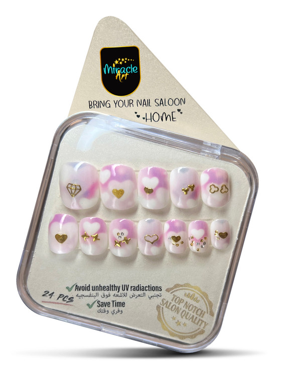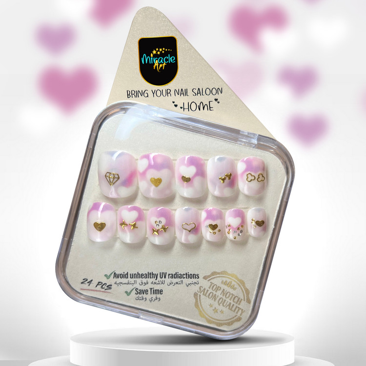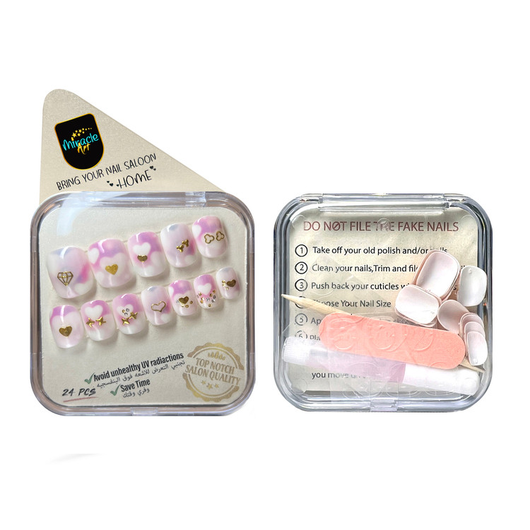 ناخن مصنوعی میراکل آرت، مدل کوتاه با طرح Purple Heart که در بسته 24 عددی عرضه گردیده است و ساخت کشور امارات میباشد. این ناخن کاشت موقت (ناخن مصنوعی) با طراحی های منحصر به فرد و زیبا که تمام آن کار دست میباشد یک محصول خاص است که یک سالن آرایشی کامل را به خانه زیباجویان می آورد. این محصول با مواد اکرلیک و ژلیش کاشت ناخن که دارای مقاومت و استحکام بسیار بالایی میباشند ساخته شده است. این محصول مناسب برای تمامی سایزهای ناخن میباشد، چرا که در بسته آن 24 عدد ناخن با سایزهای مختلف وجود دارد که مناسب برای هر فردی به طور اختصاصی است و به همین دلیل از سایز s تا xl را پشتیبانی میکند. این محصول یکبار مصرف نبوده و امکان استفاده چندین باره با رعایت اصول میسر می باشد. از مزایای این نوع ناخن مصنوعی سرعت بالا در انجام نصب و نیاز نداشتن به ترمیم میباشد. این مدل را میتوان در کمتر از چند دقیقه بر روی دست چسباند و یا جدا کرد. از دیگر ویژگی های این نوع ناخن مصنوعی بدون بو بودن، مواد اولیه غیر سمی و لبه های بسیار نازک و ظریف میباشد. افرادی که به تمیزی ناخن ها خود اهمیت میدهند و یا نیاز به ناخن موقت برای مراسم ها و جشن ها دارند و یا استفاده از لاک ناخن و کاشت دائمی برای آنها مقدور نمیباشد این محصول یک گزینه مناسب برای آنها میباشد. محتویات داخل جعبه این محصول شامل 24 عدد ناخن با سایزهای کاربردی، خلال چوبی مخصوص مانیکور، چسب مایع مخصوص، چسب استیکری دو طرفه و مینی سوهان ناخن میباشد. از ویژگی های این محصول میتوان به ظاهر بسیار طبیعی، قابلیت شستشو بودن، نصب و استفاده آسان در کمتر از چند دقیقه و قابلیت استفاده به دفعات بسیار اشاره کرد.