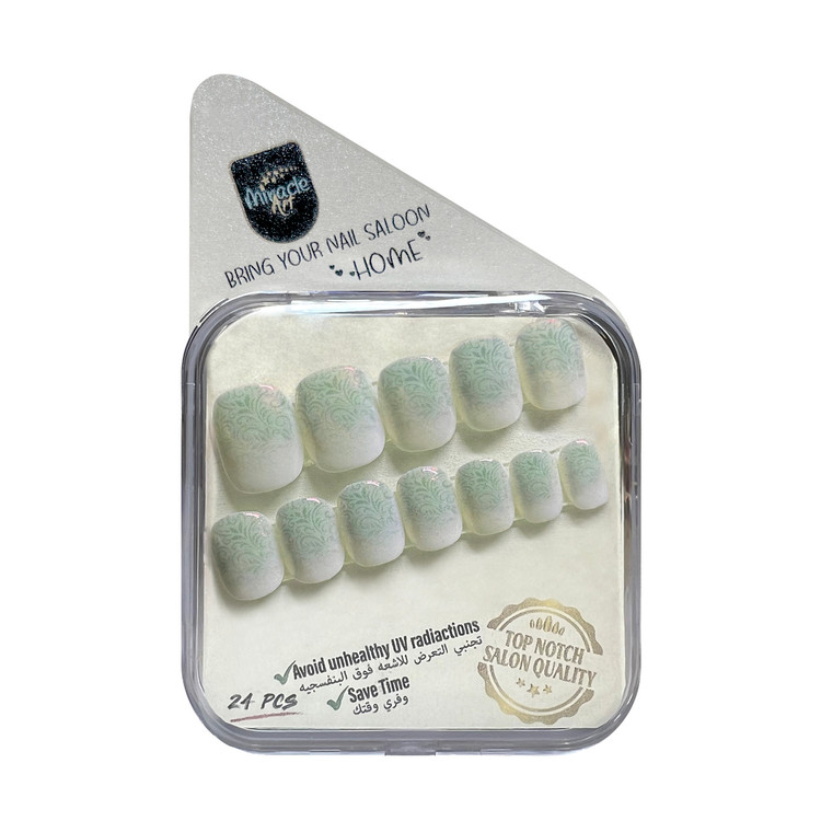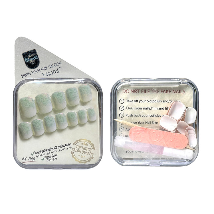 ناخن مصنوعی میراکل آرت، مدل کوتاه با طرح Ocean Ombre که در بسته 24 عددی عرضه گردیده است و ساخت کشور امارات میباشد. این ناخن کاشت موقت (ناخن مصنوعی) با طراحی های منحصر به فرد و زیبا که تمام آن کار دست میباشد یک محصول خاص است که یک سالن آرایشی کامل را به خانه زیباجویان می آورد. این محصول با مواد اکرلیک و ژلیش کاشت ناخن که دارای مقاومت و استحکام بسیار بالایی میباشند ساخته شده است. این محصول مناسب برای تمامی سایزهای ناخن میباشد، چرا که در بسته آن 24 عدد ناخن با سایزهای مختلف وجود دارد که مناسب برای هر فردی به طور اختصاصی است و به همین دلیل از سایز s تا xl را پشتیبانی میکند. این محصول یکبار مصرف نبوده و امکان استفاده چندین باره با رعایت اصول میسر می باشد. از مزایای این نوع ناخن مصنوعی سرعت بالا در انجام نصب و نیاز نداشتن به ترمیم میباشد. این مدل را میتوان در کمتر از چند دقیقه بر روی دست چسباند و یا جدا کرد. از دیگر ویژگی های این نوع ناخن مصنوعی بدون بو بودن، مواد اولیه غیر سمی و لبه های بسیار نازک و ظریف میباشد. افرادی که به تمیزی ناخن ها خود اهمیت میدهند و یا نیاز به ناخن موقت برای مراسم ها و جشن ها دارند و یا استفاده از لاک ناخن و کاشت دائمی برای آنها مقدور نمیباشد این محصول یک گزینه مناسب برای آنها میباشد. محتویات داخل جعبه این محصول شامل 24 عدد ناخن با سایزهای کاربردی، خلال چوبی مخصوص مانیکور، چسب مایع مخصوص، چسب استیکری دو طرفه و مینی سوهان ناخن میباشد. از ویژگی های این محصول میتوان به ظاهر بسیار طبیعی، قابلیت شستشو بودن، نصب و استفاده آسان در کمتر از چند دقیقه و قابلیت استفاده به دفعات بسیار اشاره کرد.