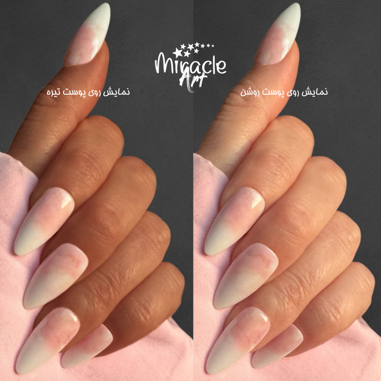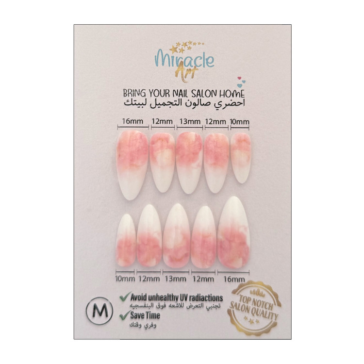 ناخن مصنوعی(کاشت موقت) میراکل آرت سایز مدیوم یا متوسط (M) مدل بادامی ، با طرح ماربل صورتی در بسته 10 عددی عرضه گردیده است و ساخت کشور امارات میباشد. این ناخن کاشت موقت (ناخن مصنوعی) که تمام آن کار دست میباشد و یک محصول خاص است که یک سالن آرایشی کامل را به خانه زیباجویان می آورد. از دیگر ویژگی های این نوع ناخن مصنوعی بدون بو بودن، مواد اولیه غیر سمی و لبه های بسیار نازک و ظریف میباشد. افرادی که به تمیزی ناخن ها خود اهمیت میدهند و یا نیاز به ناخن موقت برای مراسم ها و جشن ها دارند و یا استفاده از لاک ناخن و کاشت دائمی برای آنها مقدور نمیباشد این محصول یک گزینه مناسب برای آنها میباشد. ناخنهای مصنوعی میراکل آرت با طراحیهای جذاب و مدرن، گزینهای ایدهآل برای افرادی هستند که نه تنها به زیبایی دستان بلکه به سلامتی خود و دوری از اشعه مضر UV اهمیت میدهند. از مزایای این نوع ناخن مصنوعی سرعت بالا در انجام نصب و نیاز نداشتن به ترمیم میباشد. این مدل را میتوان در کمتر از چند دقیقه بر روی دست چسباند و یا جدا کرد.