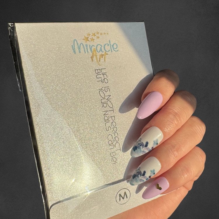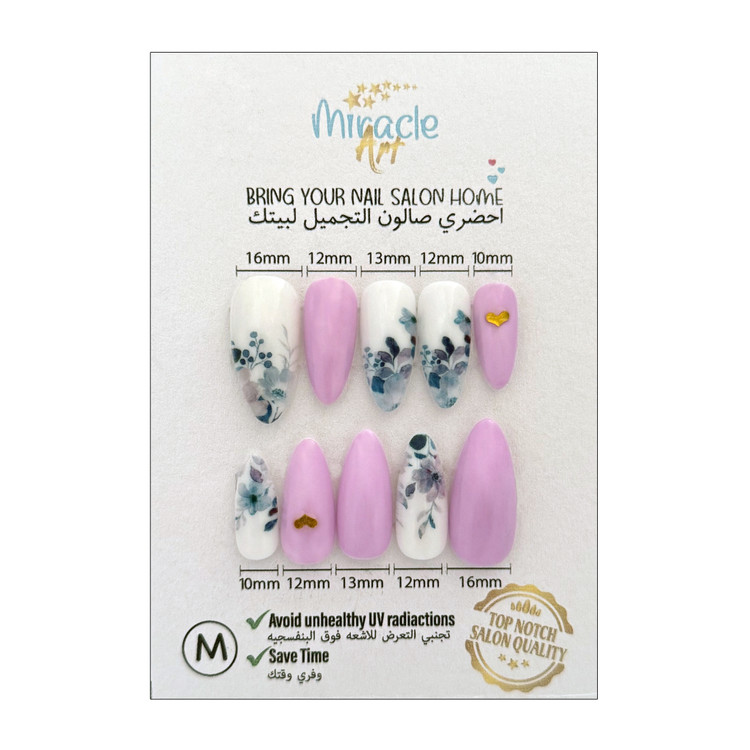 ناخن مصنوعی(کاشت موقت) میراکل آرت سایز مدیوم یا متوسط (M) مدل بادامی ، با طرح Ice Flowers در بسته 10 عددی عرضه گردیده است و ساخت کشور امارات میباشد. این ناخن کاشت موقت (ناخن مصنوعی) که تمام آن کار دست میباشد و یک محصول خاص است که یک سالن آرایشی کامل را به خانه زیباجویان می آورد. از دیگر ویژگی های این نوع ناخن مصنوعی بدون بو بودن، مواد اولیه غیر سمی و لبه های بسیار نازک و ظریف میباشد. افرادی که به تمیزی ناخن ها خود اهمیت میدهند و یا نیاز به ناخن موقت برای مراسم ها و جشن ها دارند و یا استفاده از لاک ناخن و کاشت دائمی برای آنها مقدور نمیباشد این محصول یک گزینه مناسب برای آنها میباشد. ناخنهای مصنوعی میراکل آرت با طراحیهای جذاب و مدرن، گزینهای ایدهآل برای افرادی هستند که نه تنها به زیبایی دستان بلکه به سلامتی خود و دوری از اشعه مضر UV اهمیت میدهند. از مزایای این نوع ناخن مصنوعی سرعت بالا در انجام نصب و نیاز نداشتن به ترمیم میباشد. این مدل را میتوان در کمتر از چند دقیقه بر روی دست چسباند و یا جدا کرد.