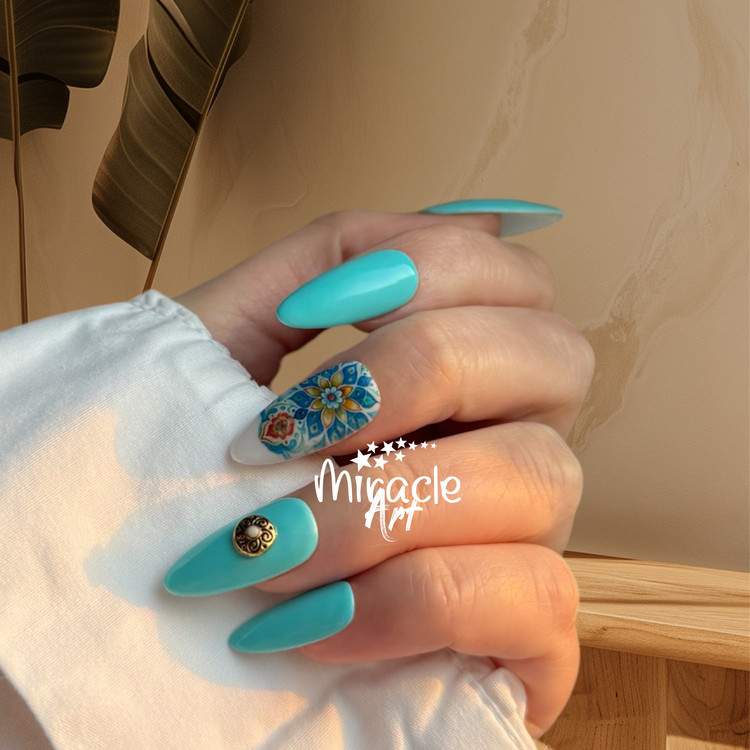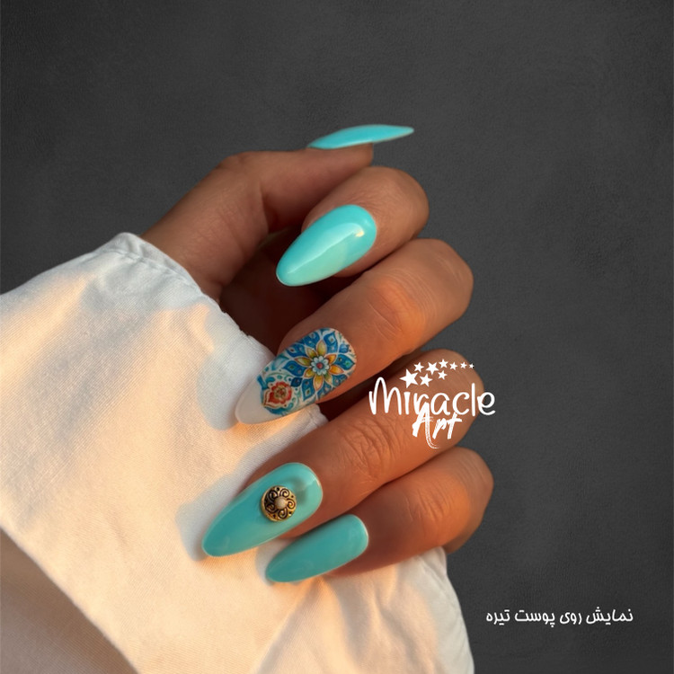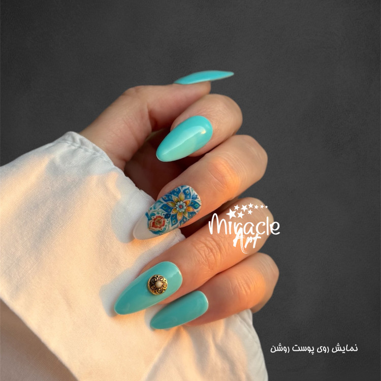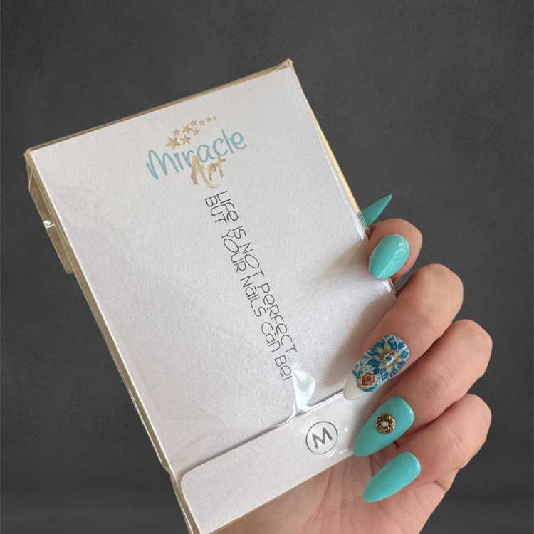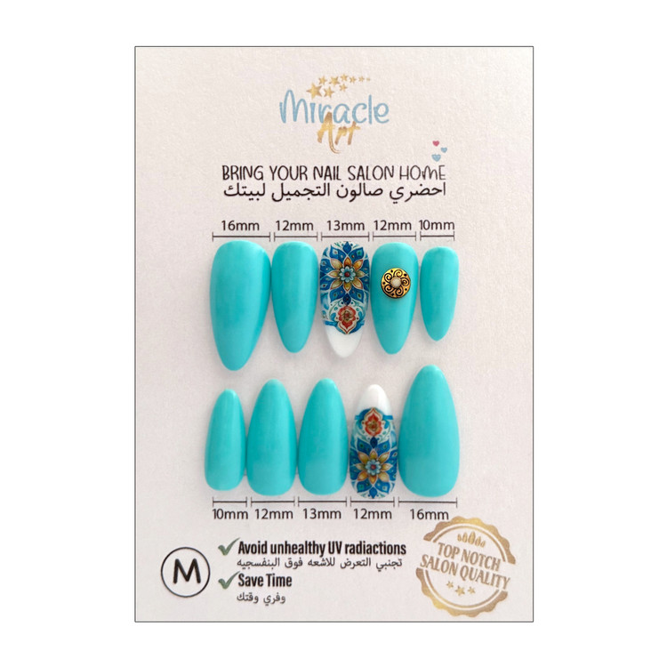 ناخن مصنوعی(کاشت موقت) میراکل آرت سایز مدیوم یا متوسط (M) مدل بادامی ، با طرح آسمان نیلی در بسته 10 عددی عرضه گردیده است و ساخت کشور امارات میباشد. این ناخن کاشت موقت (ناخن مصنوعی) که تمام آن کار دست میباشد و یک محصول خاص است که یک سالن آرایشی کامل را به خانه زیباجویان می آورد. از دیگر ویژگی های این نوع ناخن مصنوعی بدون بو بودن، مواد اولیه غیر سمی و لبه های بسیار نازک و ظریف میباشد. افرادی که به تمیزی ناخن ها خود اهمیت میدهند و یا نیاز به ناخن موقت برای مراسم ها و جشن ها دارند و یا استفاده از لاک ناخن و کاشت دائمی برای آنها مقدور نمیباشد این محصول یک گزینه مناسب برای آنها میباشد. ناخنهای مصنوعی میراکل آرت با طراحیهای جذاب و مدرن، گزینهای ایدهآل برای افرادی هستند که نه تنها به زیبایی دستان بلکه به سلامتی خود و دوری از اشعه مضر UV اهمیت میدهند. از مزایای این نوع ناخن مصنوعی سرعت بالا در انجام نصب و نیاز نداشتن به ترمیم میباشد. این مدل را میتوان در کمتر از چند دقیقه بر روی دست چسباند و یا جدا کرد.