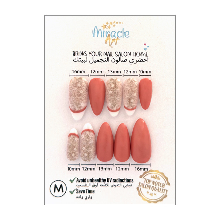 ناخن مصنوعی(کاشت موقت) میراکل آرت سایز مدیوم یا متوسط (M) مدل بادامی ، با طرح گل های شرقی در بسته 10 عددی عرضه گردیده است و ساخت کشور امارات میباشد. این ناخن کاشت موقت (ناخن مصنوعی) که تمام آن کار دست میباشد و یک محصول خاص است که یک سالن آرایشی کامل را به خانه زیباجویان می آورد. از دیگر ویژگی های این نوع ناخن مصنوعی بدون بو بودن، مواد اولیه غیر سمی و لبه های بسیار نازک و ظریف میباشد. افرادی که به تمیزی ناخن ها خود اهمیت میدهند و یا نیاز به ناخن موقت برای مراسم ها و جشن ها دارند و یا استفاده از لاک ناخن و کاشت دائمی برای آنها مقدور نمیباشد این محصول یک گزینه مناسب برای آنها میباشد. ناخنهای مصنوعی میراکل آرت با طراحیهای جذاب و مدرن، گزینهای ایدهآل برای افرادی هستند که نه تنها به زیبایی دستان بلکه به سلامتی خود و دوری از اشعه مضر UV اهمیت میدهند. از مزایای این نوع ناخن مصنوعی سرعت بالا در انجام نصب و نیاز نداشتن به ترمیم میباشد. این مدل را میتوان در کمتر از چند دقیقه بر روی دست چسباند و یا جدا کرد.