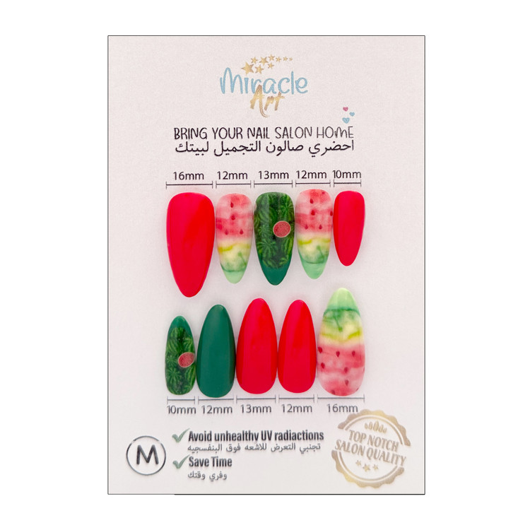 ناخن مصنوعی(کاشت موقت) میراکل آرت سایز مدیوم یا متوسط (M) مدل بادامی ، با طرح Long Night در بسته 10 عددی عرضه گردیده است و ساخت کشور امارات میباشد. این ناخن کاشت موقت (ناخن مصنوعی) که تمام آن کار دست میباشد و یک محصول خاص است که یک سالن آرایشی کامل را به خانه زیباجویان می آورد. از دیگر ویژگی های این نوع ناخن مصنوعی بدون بو بودن، مواد اولیه غیر سمی و لبه های بسیار نازک و ظریف میباشد. افرادی که به تمیزی ناخن ها خود اهمیت میدهند و یا نیاز به ناخن موقت برای مراسم ها و جشن ها دارند و یا استفاده از لاک ناخن و کاشت دائمی برای آنها مقدور نمیباشد این محصول یک گزینه مناسب برای آنها میباشد. ناخنهای مصنوعی میراکل آرت با طراحیهای جذاب و مدرن، گزینهای ایدهآل برای افرادی هستند که نه تنها به زیبایی دستان بلکه به سلامتی خود و دوری از اشعه مضر UV اهمیت میدهند. از مزایای این نوع ناخن مصنوعی سرعت بالا در انجام نصب و نیاز نداشتن به ترمیم میباشد. این مدل را میتوان در کمتر از چند دقیقه بر روی دست چسباند و یا جدا کرد.